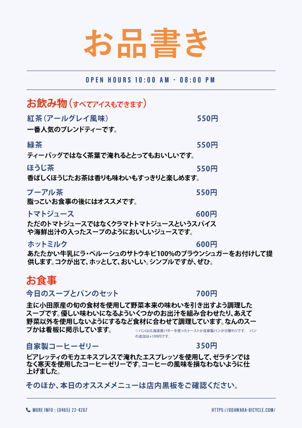 小田原の地場産食材をなるべくたくさん使用したいと思い、地場食材を使用したスープと自家製パン、地元商店の商品を使ったメニューなどを作っています。